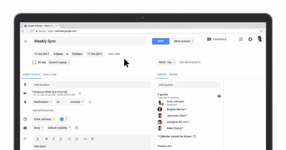 If you work in a fairly large company, setting up meetings with colleagues may be challenging, not to mention finding a place to meet in. Now your G Suite admins can label your various meeting rooms with details like size, availability of a/v equipment, and of course availability. If you want to use a room, hover over the room name and you’ll see a hovercard with all the details you may need. You can also now add rich formatting and hyperlinks when you send Calendar Invites so your attendees can access materials needed for the meeting.