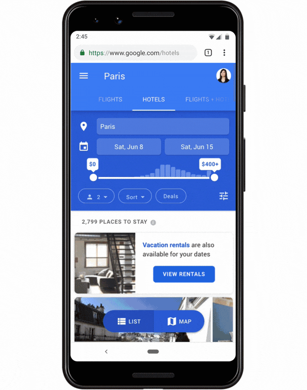 When you go to google.com/hotels on your mobile device, you’ll receive a notification that vacation rentals are now included in your options when you’re trying to book accommodations for your next trip. They are currently partnering with Expedia, HomeAway, Hotels.com, NextPax, RedAwning, Rentals United, TripAdvisor, VRBO, etc (no Air BnB anywhere there).