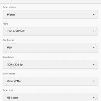 From the app, you can select the options for printing including the type of document, resolution, or if it should be in color or black and white. When scanning, you can also set to PDF or PNG, select scan sare, or re-print a scan.