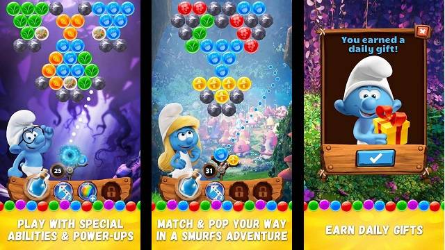 The game features some of the famous Smurf characters like Smurfette, Hefty, Brainy, Clumsy, as they go on quests and missions, most of which of course involves just popping bubbles. Along the way, you will be encountering wild animals, go through a mysterious forest, and try to escape Gargamel and his minions. You will also need to build your ultimate Smurfs collection so you can use their special abilities to blitz through the missions.